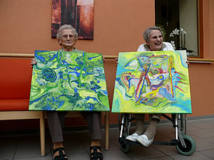 Der Soester Kunstpädagoge Heribert Britten leitete die Bilder an, die Bewohnerinnen des Hauses fertigten sie an. Frieda Klinger und Ursula Loewende sind zwei davon, die dies mit großer Freude und Energie taten. In wechselnder Zusammensetzung - zu dritt oder viert - bemalten sie eine Leinwand mit Acrylfarbe.