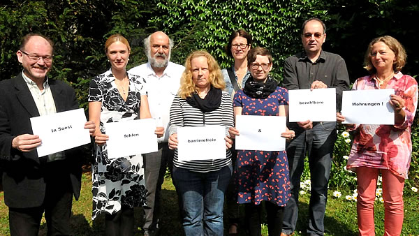 "In Soest fehlen barrierefreie und bezahlbare Wohnungen", das meinen: Heinz Drucks (Flüchtlingsberatung, Diakonie), Michaela Vollmer (Ambulant betreutes Wohnen, Perthes) Michael König (Sozialberatungstelle, Perthes), Ivonne Brose-Napierski (Walpurgis- und Heinrich-Oberwinter-Haus, Perthes), Ulrike Dustmann (Frauenhaus Soest, Evangelische Frauenhilfe in Westfalen e.V.), Silvana Freier (Behindertenberatung, Diakonie), Peter Wiesrecker (Wohnhaus Briloner Straße, Perthes ) und Eva Borgmann (Wohnberatung, Caritas)