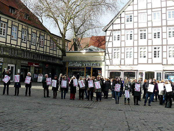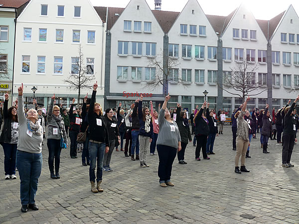 Unter Leitung von Stefanie Feldmann vom Soester Ballettstudio kamen Frauen und Männer zusammen, um - wie in anderen 200 Ländern an diesem Tag - das Ende von Gewalt an Frauen und Mädchen zu fordern. Im Jahr 2014 sind 1 Milliarde Menschen weltweit für diese Forderung auf die Straße gegangen und haben getanzt.