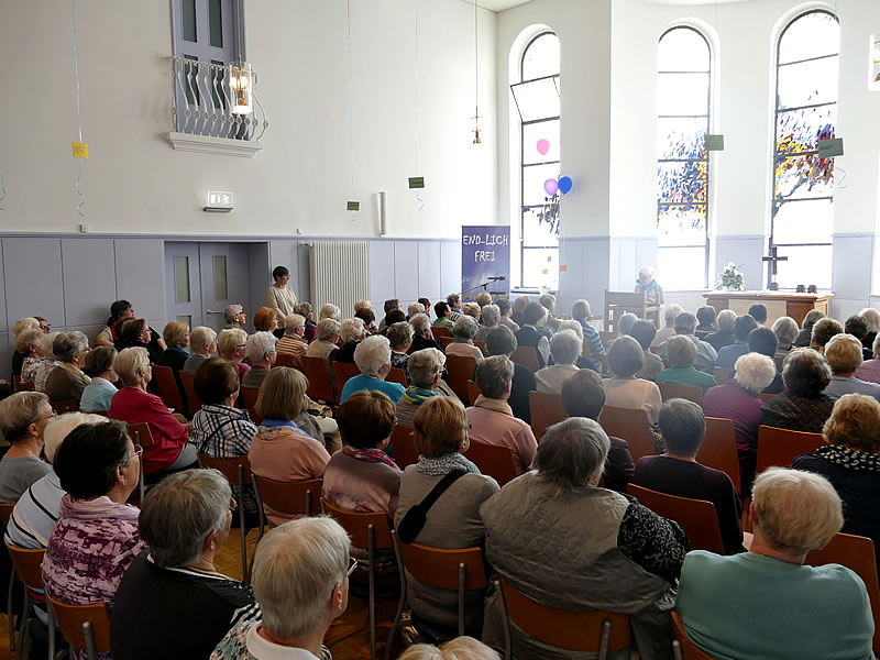 „Ich weiß ja nicht, was mich erwarten wird. Aber ich bin gerne gekommen und freue mich auf einen Tag bei der Frauenhilfe und lasse mich ganz einfach fallen…“, meinte eine der Bezirksfrauen zu Beginn. Die Evangelische Frauenhilfe in Westfalen hatte Bezirksfrauen und Gruppenleiterinnen eingeladen, um ihnen für ihre wertvolle Arbeit Dank zu sagen und einen „Oasentag für Bezirksfrauen und Gruppenleiterinnen der Frauenhilfe“ zu erleben - einen Tag zum Aufatmen, einen Tag für die Seele. Das Motto der Oasentage lautete „End-lich frei. Reformation 500plus. Frauenhilfe 111plus.“ Es verbindet das Reformationsjubiläum und das Frauenhilfejubiläum. Der Andrang war so groß, dass sich die Evangelische Frauenhilfe in Westfalen e.V. entschloss, vier Tage hintereinander, vom 11. - 13. Mai und am 15. Mai 2017 - zu „Oasentagen“ einzuladen.