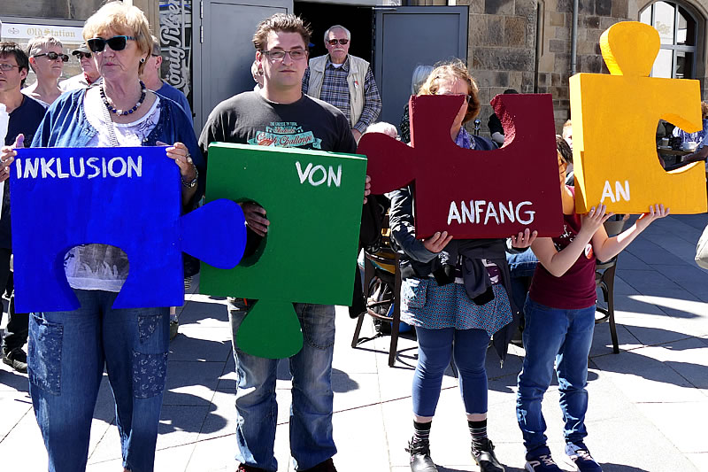 „Mit dieser Feier auf dem Bahnhofsplatz wollen wir auch den vielen Bürgerinnen und Bürgern danken, die sich seit Jahren so leidenschaftlich am gesamten Aktionsplan-Prozess in Wetter beteiligen“, erklärte die Frauenheim-Leiterin. Bei dieser Abschlussveranstaltung wiesen die Vertreter und die Vertreterin der Kooperationspartner des Aktionsplanes – Bürgermeister Frank Hasenberg, Pfarrer Jürgen Dittrich und Edelgard Spiegelberg – auf die Bedeutung der Veranstaltung im Rahmen des „Europäischer Protesttag zur Gleichstellung von Menschen mit Behinderung“ hin.