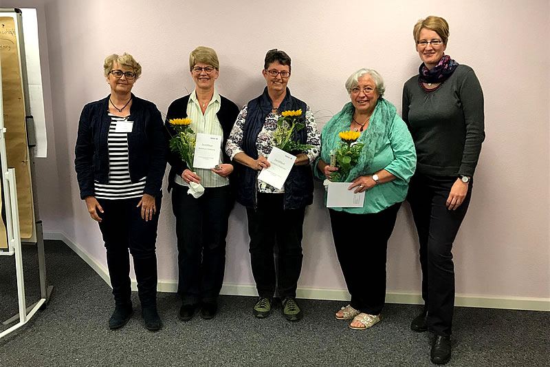 Die Referentinnen Claudia Montanus und Kathrin Sundermeier (r.), Bethel, gratulierten (ab 2.v.l.) Sibylle Hänsler, Claudia Grothe und Karin Ostroga zum qualifizierten Zertifikat über den „Basiskurs Kirche & Diakonie“.
