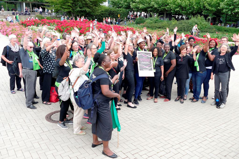 Am Donnerstag wurde die Kampagne des Ökumenischen Rates der Kirchen "Thursdays in black" bzw. "Donnerstag in Schwarz" stärker bekannt gemacht. Mehr als 100 Menschen kamen zum Fototermin – viel mehr Menschen jedoch trugen bei sehr warmen Temperaturen den gesamten Tag schwarze Kleidung und den Button. So wurde beim Kirchentag ein sichtbares Zeichen der Solidarität und gegen Gewalt und Vergewaltigung gesetzt!