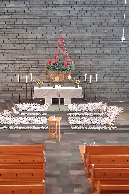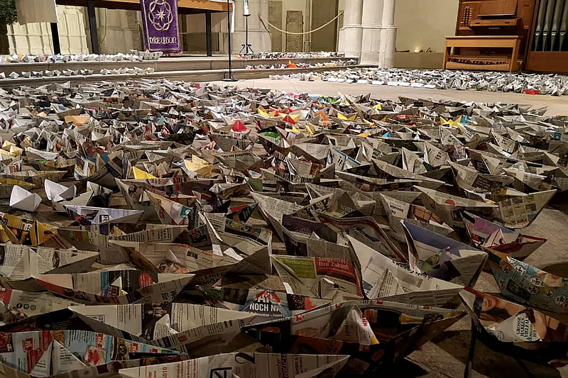 In Münster wurde das Ausmaß der Totenzahlen durch die Papierboote im Altarraum sichtbar gemacht.