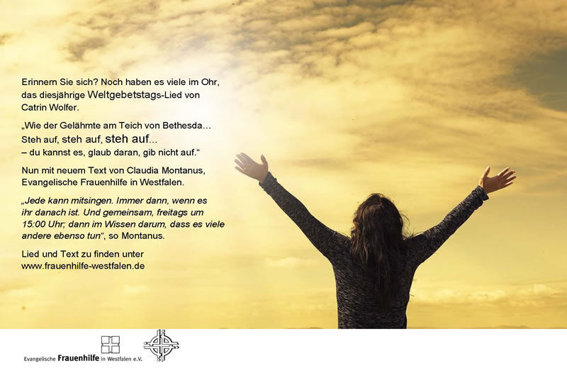 Welche Lieder können bundesweit Menschen singen angesichts der Sorgen in der Corona-Krise? Was schenkt Hoffnung, nicht in Furcht, in Überforderung oder Einsamkeit zu erstarren? Anknüpfend an den Ohrwurm und an die guten Erfahrungen mit der Zusage „Steh auf - du kannst es“, verfasste die Verbandsreferentin der Evangelischen Frauenhilfe in Westfalen, Claudia Montanus einen aktualisierten Text. Er greift die Sorgen in dieser besonderen Zeit auf.