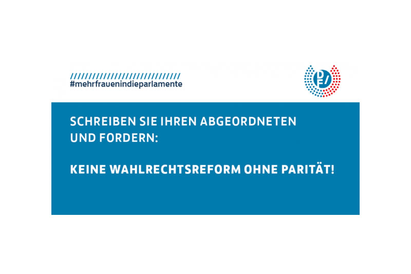 Aktuell stehen die Verhandlungen im Bundestag zur Wahlrechtsreform an. Mit der Kampagne #mehrfrauenindieparlamente fordern wir gemeinsam von den politischen Verantwortlichen, im Rahmen von Wahlrechtsreformen sicherzustellen, dass Männer und Frauen je zur Hälfte die Mandate in den Parlamenten innehaben.