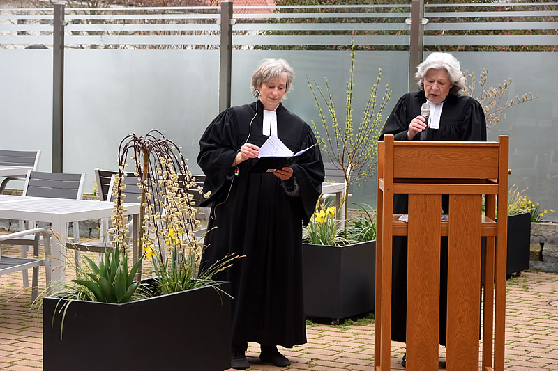 Pfarrerin Angelika Weigt-Blätgen und Pfarrerin Lindtraut Belthle-Drury gestalteten gemeinsam und dennoch mit dem nötigen Abstand die drei Gottesdienste, an denen die Bewohner*innen, Mitarbeiterinnen und Mitarbeiter sowie Gäste von Fenstern, Terrassen, Balkonen und Gärten teilnehmen konnten.