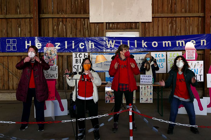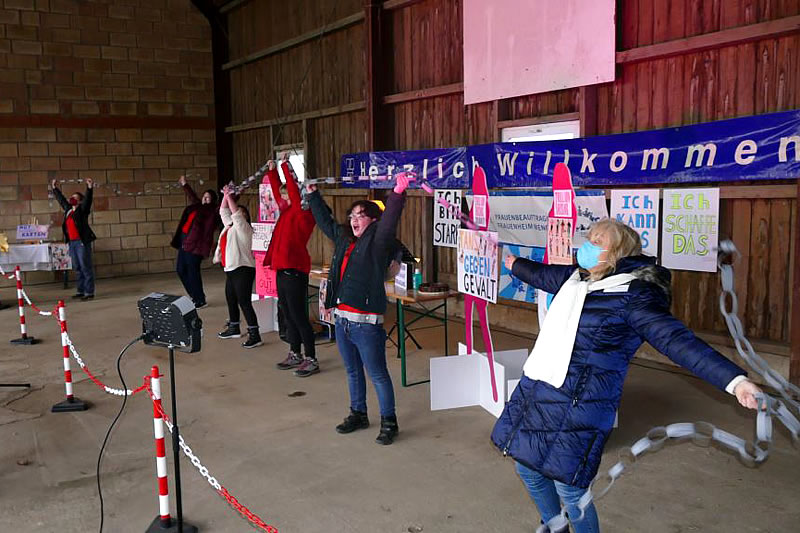 „AHA-Regeln einhalten, Nachverfolgung der Teilnehmerinnen, Impfstatus überprüfen, großen Raum mit Überdachung im Freien finden – das hat alles mehr Zeit in Anspruch genommen und hat uns mehr Kopfzerbrechen gemacht als die normalen Vorbereitungen. Texte schreiben, Reden einüben, Mut-Mach-Karten und Kette zum Sprengen basteln sind dagegen nichts“, meinten die Organisatorinnen. Zum Mittanzen motivierte das Tanz-Theater „Tanz“ unter der Leitung von Ilona Korge-Niehaus die Anwesenden. Ein paar Männer beteiligten sich auch, um gegen Gewalt gegen alle Geschlechter zu protestieren.