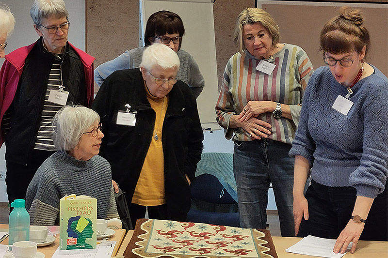 Dass eine Teilnehmerin unter ihnen sein würde, die einen echten Fischerteppich mit Zertifikat mitbringen würde, war ein Highlight und regte zusätzlich die Diskussion an. Über die Personen im Roman wurde sich ausgetauscht, unterschiedliche Sichtweisen präsentiert, über Wahrheit und Fälschung philosophiert, auch über die Veränderung in Mias Leben, neben dem Teppich die 2. Hauptperson. Der Transfer ins eigene Leben erregte Interesse: Wie gestalte ich mein Leben möglichst wahrhaftig? „Spannend war’s! Mehr davon!“ waren sich die Teilnehmerinnen einig.