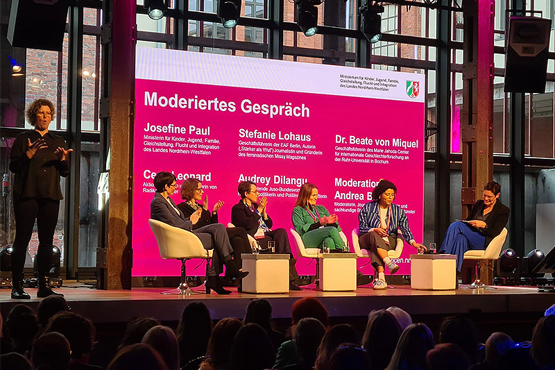 Zudem waren auf dem Podium Stefanie Lohaus, Geschäftsführerin der EAF Berlin, Autorin, Journalistin und Gründerin des feministischen Missy Magazine; Cesy Leonard, Aktionskünstlerin und Gründerin von Radikale Toechter; und Audrey Dilangu, stellvertretende Juso-Bundesvorsitzende, Kommunalpolitikerin und Politikwissenschaftlerin.