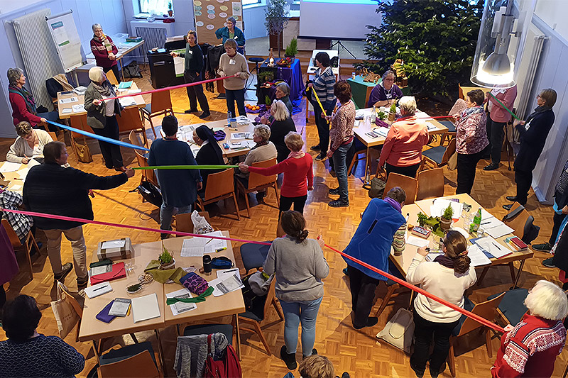 Das Thema Antisemitismus, bei steigenden antisemitischen Äußerungen und Straftaten, war zentral: Es wurde erläutert, diskutiert und die Vieldeutigkeit und Spannung (Ambiguität) der aktuellen Situation im Rollenspiel eindrücklich aufgezeigt. Wie soll mit den Spannungen umgegangen werden? Claudia Montanus ließ es praktisch mit Gymnastikbändern ausprobieren. Die Übungen sollten eine innere Haltung stärken, auf die Erfordernisse dieses besonderen Weltgebetstags vorbereitet zu sein und Antwort geben zu können.
