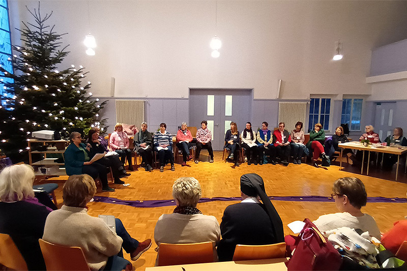 Zu den Fürbitten wurde je eine Kerze auf das lila Band gestellt. „Für mich wurde dadurch deutlich“, so eine Teilnehmerin, „dass das Klagen angesichts der Situation in Nahost wichtig und wertvoll ist. Es gilt nicht, zu beschwichtigen oder Lösungen zu suchen, sondern die Stimmen der Schwestern ernst zu nehmen, für sie zu beten, Projekte zu unterstützen… Und dabei doppelte Solidarität zu üben: mit Israel, mit Palästina. Das ist jetzt unsere Aufgabe.