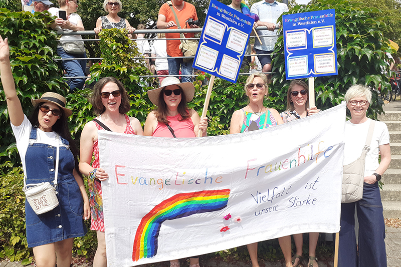 Als Bündnispartnerin im ‚Bündnis CSD Soest‘ ermunterte die Leitende Pfarrerin Birgit Reiche im Namen der Evangelische Frauenhilfe in Westfalen (EFHiW) alle Mitarbeitenden, beim CSD dabei zu sein. Die Mitarbeitenden des FRAUENHAUS SOEST liefen fast vollzählig mit. Unter dem Motto „Respekt beginnt da, wo Vorurteile aufhören“ machte sich die Beratungsstelle TAMAR mit einem eigenen Stand am Schlachthof für Respekt für Sexarbeitende stark. Und Lena Sauerland von der FRAUENBERATUNG SOEST verstärkte das Awareness-Team: „Vielfalt ist keine Ausnahme – sie ist unsere größte Stärke. Das konnten wir deutlich fühlen und feiern", freute sich die Sozialarbeiterin und Systemische Therapeutin.